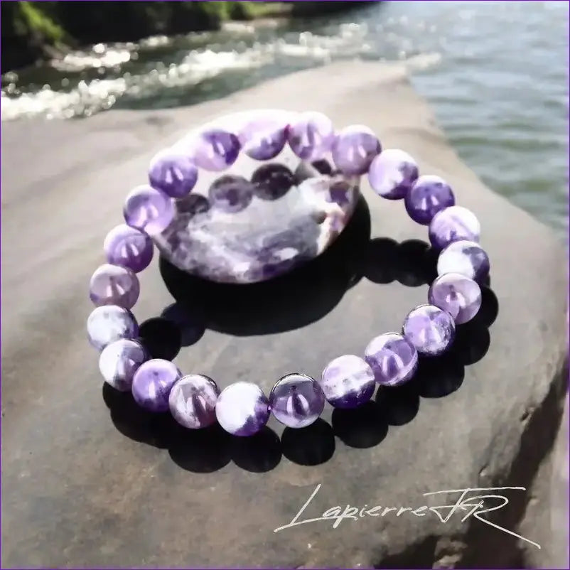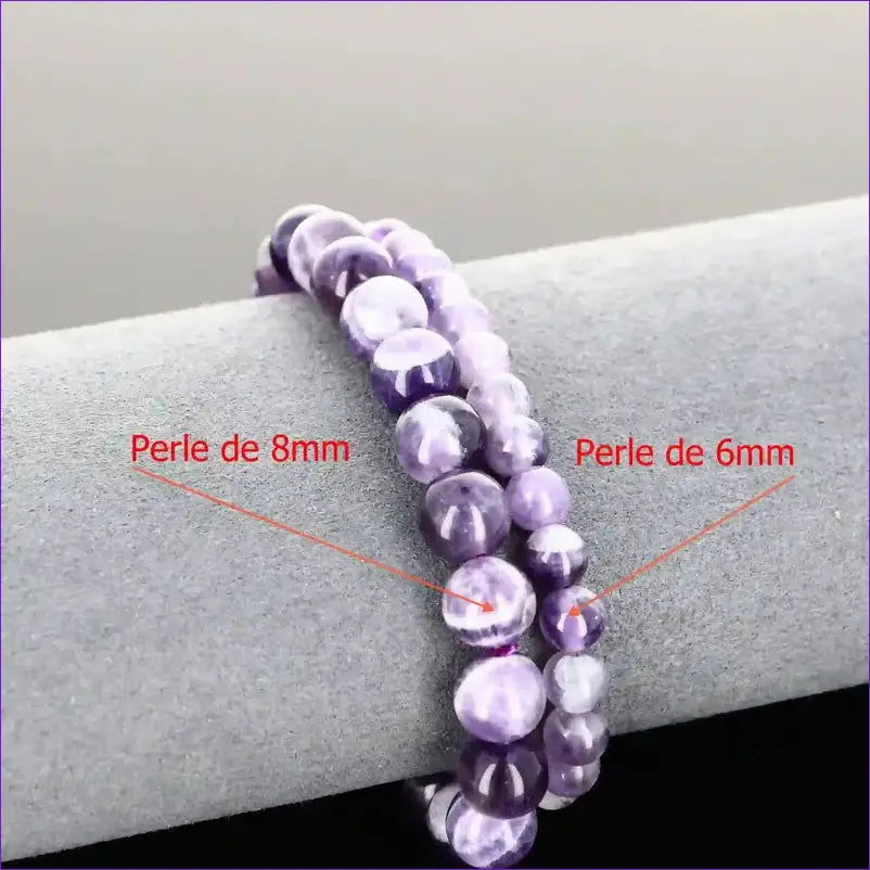 Explorez les énergies combinées de ce bracelet en Améthyste Chevron, une variété unique d'Améthyste naturelle. Composé de perles naturelles rondes (ou boules) de 6mm ou 8mm, ce bracelet pierre naturelle est monté sur un fil élastique résistant et proposé sur mesure (tailles 12 à 18 cm).
