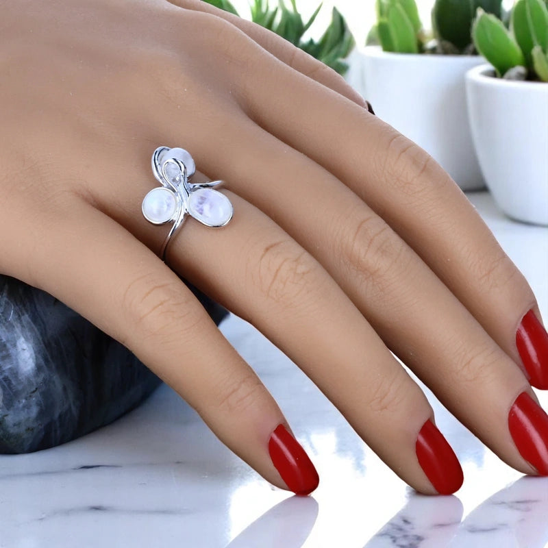 Cette bague pierre de lune réunit trois gemmes naturelles : un ovale 6×8 mm et deux cabochons ronds de 6 mm, disposés en motif floral élégant.