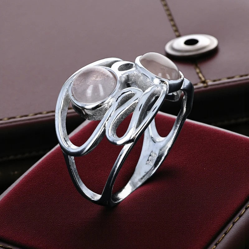 Notre bague en quartz rose célèbre l’harmonie des formes avec deux cabochons assortis, sertis sur une monture arabesque en argent 925 rhodié.