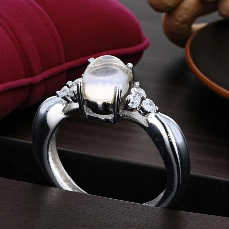 La monture sculptée met en valeur la pierre laiteuse et ses nuances tendres. Les 6 zirconia latéraux apportent une lumière précise et féminine.