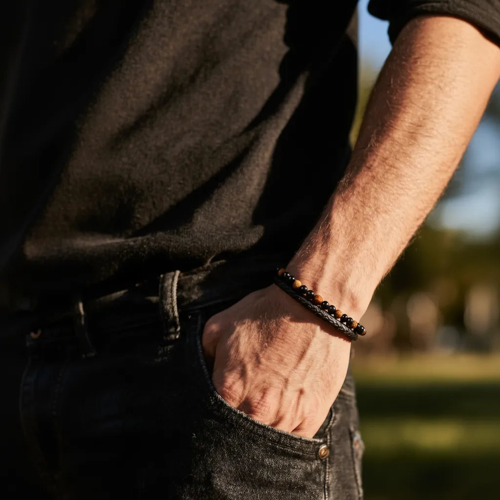 Charisme, protection et élégance. Ce bracelet cuir noir et pierre naturelle associe l’Œil de Tigre et l’Onyx noir pour un style masculin, affirmé et intemporel. Conçu pour durer, il marie cuir véritable, pierres naturelles et acier inoxydable 304 de qualité professionnelle.